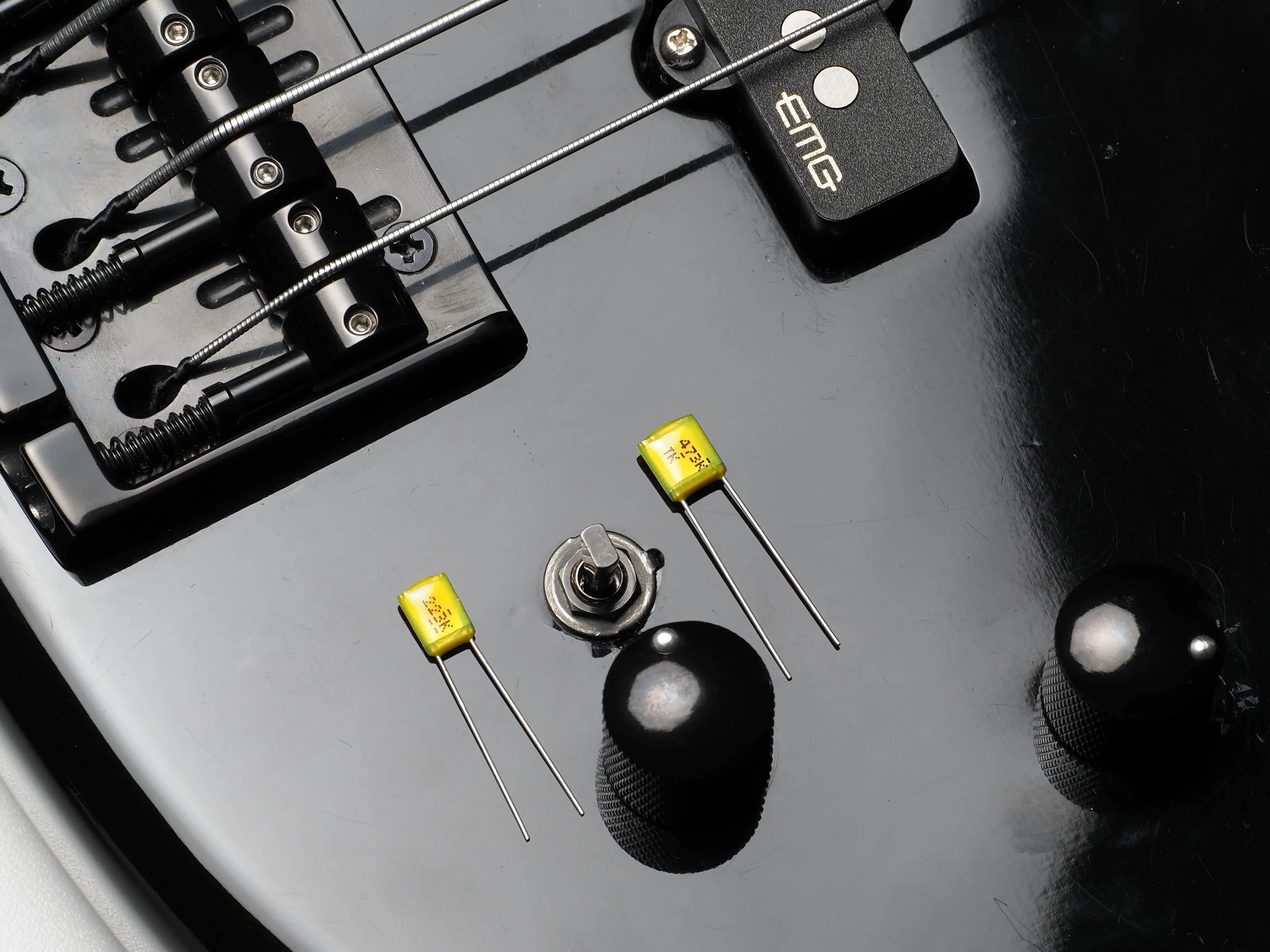 My latest research project was the possibility to select different tone caps. Basically, the higher the value of the capacitor, the more vintage the sound. Typical for bass guitars is 47 nF. For normal electric guitars it’s 22 nF, and for the real vintage bass guitar sound some people use 68 nF caps. Combining a 22 nF and a 47 nF cap through an “on-on-on” switch, there is a possibility to select between the values 22 nF, 47 nF and 69 nF. The latter is achieved when both caps work in parallel, which is the middle position of an “on-on-on” switch.