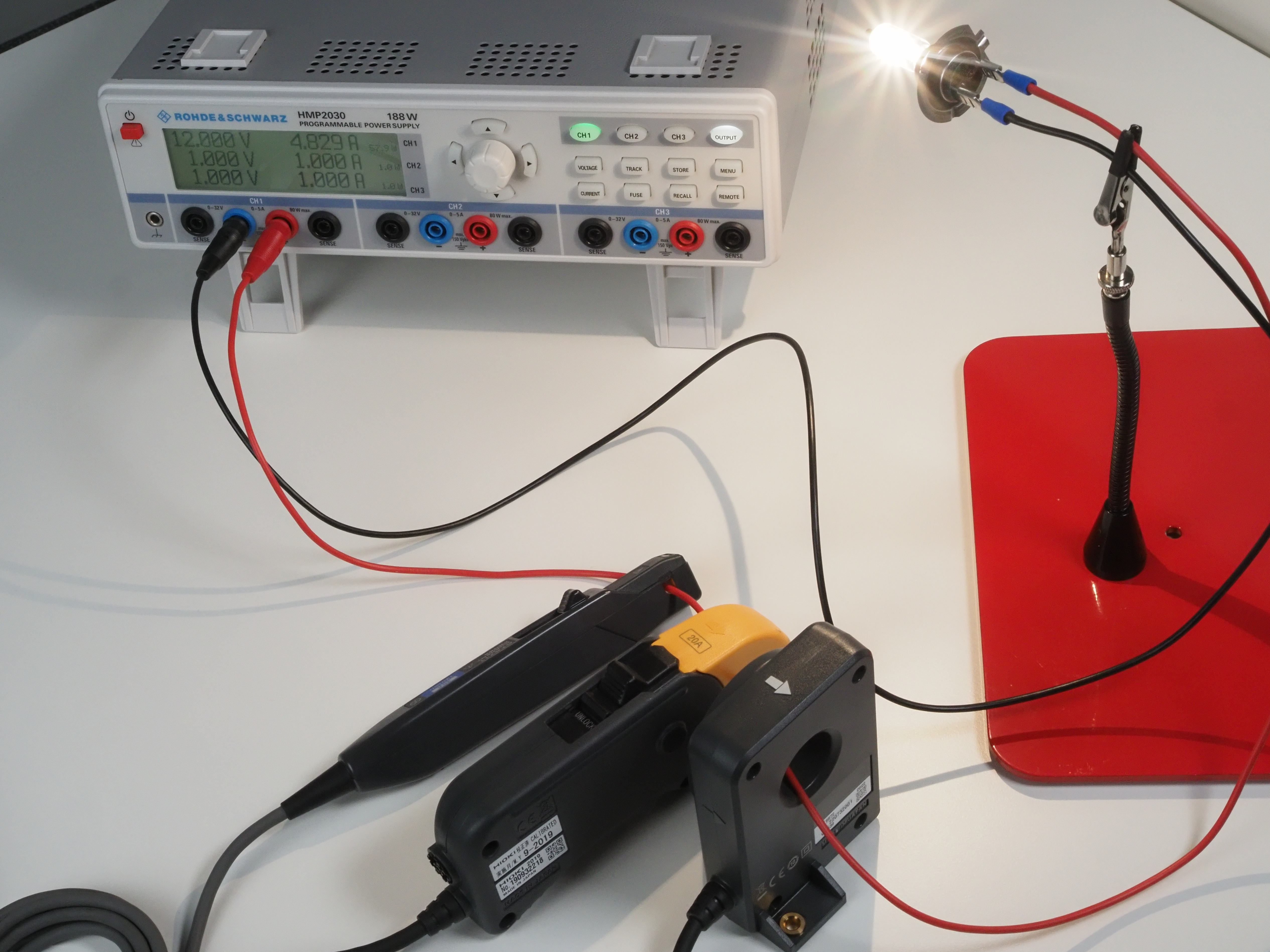 To show what DC drift in a hall-sensor based current probe means, I took a DC power supply, connected a 50 watts car light bulb with a supply voltage of 12V and picked a hall sensor based current probe as well as two fluxgate based current sensors for a comparison.