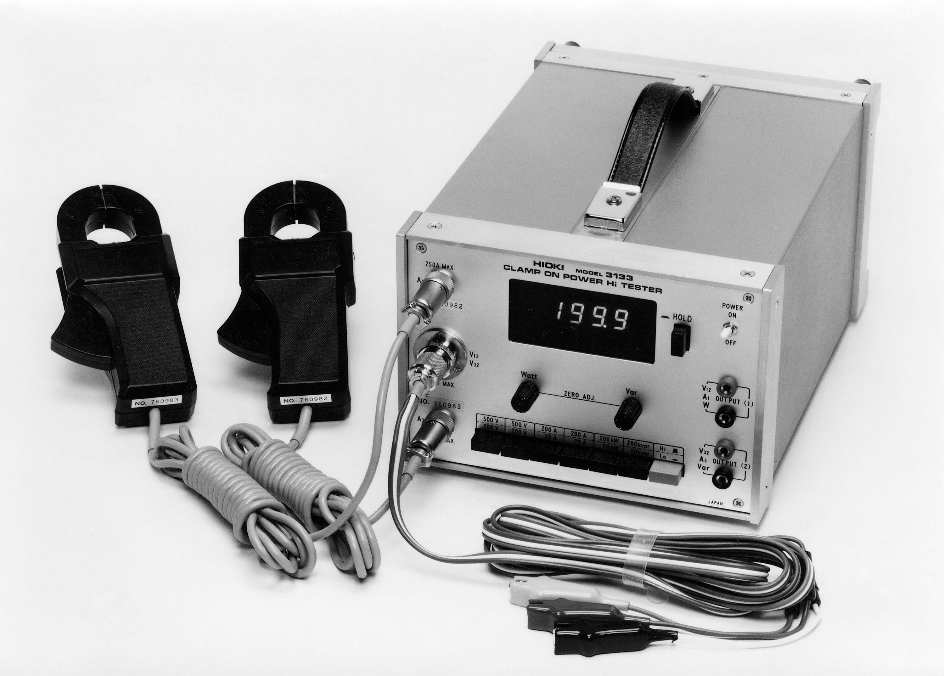 But of course clamp meters are not the only HIOKI current sensing devices. In 1978 HIOKI released six different types of power meters to be used with clamp-on current sensors. One of them was the portable 3131 clamp-on power tester.